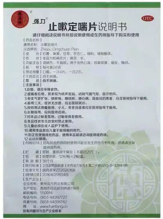 ![]() PRRT 03 德昌祥止嗽定喘片组方与麻杏石甘汤组方相同:由石膏、麻黄、甘草和苦杏仁四味药组成,亦称为“麻杏石甘片”。止嗽定喘片功能主治:清肺热,平咳喘。用于发热口渴,咳嗽痰黄,喘促,胸闷。其功能主治与麻杏石甘汤亦相同。 ![]() ![]()
