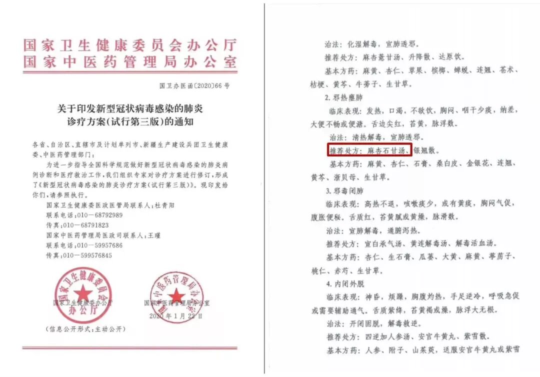 ![]() PRRT 01 国家卫健委指出:疾病以呼吸道传播为主,在《新型冠状病毒肺炎诊疗快速指南》中的中医治疗部分明确指出,本属于中医疫病范畴,疾病因为感受疫戾之气,病位在肺,基本病机特点为“湿、热、毒、瘀”。该病的治疗给出了明确的症型与治疗方案,其中基本方案之一便是麻杏石甘汤。 ![]() ![]() |