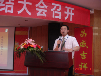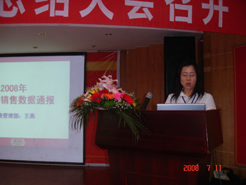 总经理蒋晓文女士作总结发言,蒋总说,今年上半年公司遇到了众多困难和压力,尤其年初五十年难遇的凝冻灾害让工厂一度停产四十多天,为了保证市场供货,工厂克服重重困难在第一时间实现灾后重建、恢复生产,工厂的众多员工成为我们上半年完成良好业绩的无名英雄;上半年从市场的整体发展来看,主要有两个亮点,一是云南市场销售增长迅速,得益于云南市场在广告宣传、渠道建设和服务跟进方面工作比较到位,云南市场已经成为公司省外市场发展的样板,下半年省外各OTC市场要以云南市场为样板,根据本市场的实际状况积极调整和改进;二是遵义市场梁正家先生用一贯的工作态度和作风保持着遵义市场的稳定发展,所谓“大业靠德”,公司要大力倡导“梁哥精神”,各位员工要努力学习“梁哥精神”,那就是要求我们在日常的工作中态度端正、工作刻苦、服务到位,省内各市场要把“梁哥精神”运用到实际工作中,以遵义市场为样板切实做好市场销售工作。对于下半年的工作,蒋总要求商务工作按照邹晓生总监的工作计划组织实施;广告宣传工作按照陈宇航总监的工作计划实施;为进一步加强终端督导,公司各市场要严格按照许翔经理的工作计划开展工作。