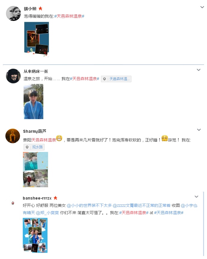 进入温泉,同事们便自发的分成了拨,各自向自己喜欢的温泉走去,有的在山洞的温泉里、有的在林间小路的温泉里,玩的不亦乐乎。