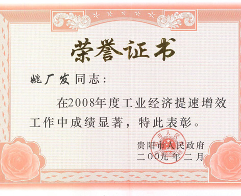 2008年在面对全球金融危机的大背景下,德昌祥药业经营业绩取得了历史性突破,实现了快速、健康发展,对地方经济建设做出了积极贡献。针对德昌祥在2008年度工业经济提速增效工作中成绩显著,贵阳市政府特给予德昌祥药业董事长姚厂发先生表彰奖励。