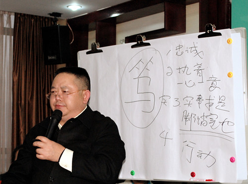 最后,姚总用一个“笃”字与参会人员共勉。“笃”字共有四个释义,即忠诚,一心一意;执着;实事求是;行动。姚总说:“新的一年,新的开始,希望大家忠诚于自己的初衷,执着于为实现目标而实事求是地奋斗,用行动为2015年交上满意的答卷。把企业的希望变成整个团队的希望,把全体员工的希望变成现实。”