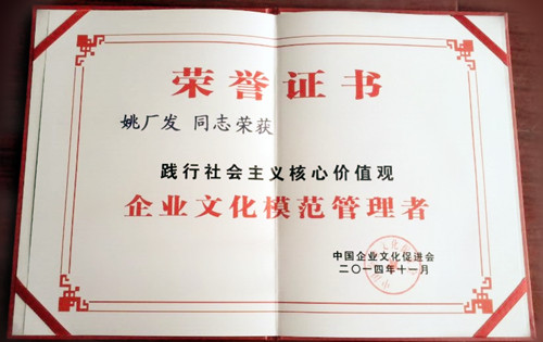 会议表彰了企业文化建设示范基地、模范单位、突出贡献人物等集体和个人。公司获评全国“企业文化模范单位”殊荣,姚厂发董事长获评全国“企业文化模范管理者”称号。