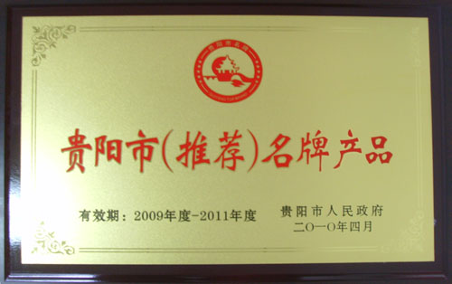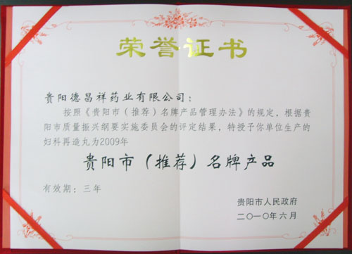 2010年8月16日,在贵州饭店召开了由贵阳市人民政府贵阳市质量振兴委员会组织的2009年贵阳市名牌产品授牌颁奖大会,我公司品种妇科再造丸获贵阳市人民政府颁发的2009年贵阳市(推荐)名牌产品称号。