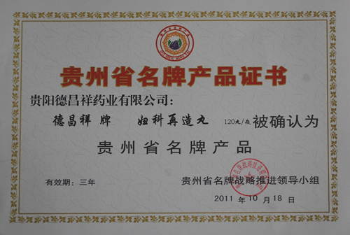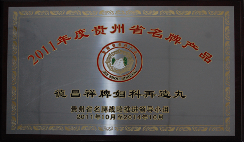11月23日,2011年贵州省名牌产品颁证授牌大会在贵阳市召开。我公司拳头产品妇科再造丸获得贵州省名牌产品荣誉,并颁发名牌产品证书、名牌产品奖牌。