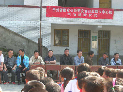 经过一路颠簸,于中午12点到达栽麻乡政府,稍作休整,蒋厅即率贵州省医疗保险研究会、贵阳德昌祥药业有限公司董事长姚厂发先生、深圳健康元总经理卢致剑等到栽麻乡中心小学进行爱心捐赠,蒋厅在捐赠仪式上说:孩子是祖国的未来,国家的希望,这次捐赠的不仅是粮油,而是一份爱心,一份关注,他代表贵州省人社厅、贵州省医疗保险研究会感谢贵阳德昌祥药业有限公司、深圳健康元药业集团等企业的爱心捐赠,并表示以后还会继续关心贫困乡的孩子们。栽麻乡政府、中心小学的领导分别在捐赠仪式上表达了对政府和企业的感谢。