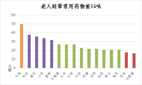在整理国医大师对众多老年眩晕患者病历中,中医证候主要为:阴虚阳亢、气血亏虚、肝肾不足、痰湿中阻、脾肾不足型;处方中治疗眩晕最常见药物依次为天麻、枸杞、菊花、川芎、葛根、石菖蒲、白术、甘草、丹参、钩藤、茯神、知母、麦冬、黄芪、茯苓、白蒺藜。