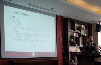 其次由品牌策划部韩贤豪经理作《新汉方企业文化构架》报告。韩经理指出:“新汉方独家及特色品种丰富,更有利于产品品牌做大做强;新汉方进行优势产品资源重组,更有利于提升产品族群及产品线竞争力;新汉方新的企业文化整合,更有利于大幅度提升公司运营能力;新汉方崭新的企业形象,更有利于进行全新的企业品牌建设。所以,新汉方未来的核心竞争力可以从专业性、民族性、创新性及诚信、平等、开放、快乐、共享等意寓去提炼,从构架企业文化识别系统”。公司领导普遍认同韩经理的提案,同时要求对相关内容作进一步的提炼和优化。