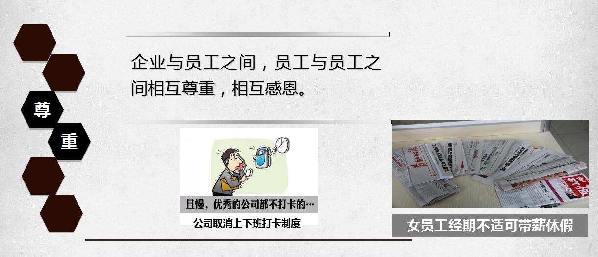 尊重员工的意见,尊重员工的行为,尊重员工的付出,领导不摆架子,真诚地关爱员工,与员工平等相处。