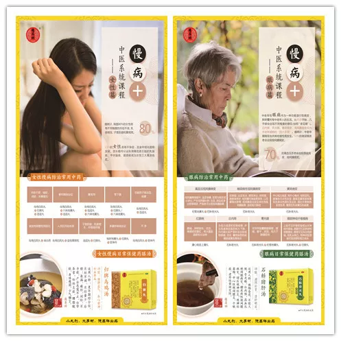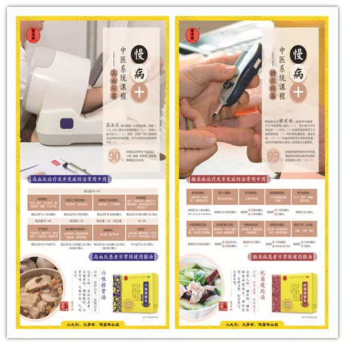 由于空间限制,本次展会仅展出了慢病“+”中医康复系统课程其中四大课程——高血压篇、糖尿病篇、女性篇、眼病篇。每个篇章简要但却清晰地展示了每种慢病的现状、危害、病症、中医联合用药以及对应疾病推荐饮用的药膳汤。