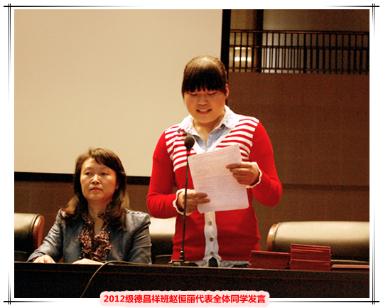 最后由2012级德昌祥班赵恒丽代表全体同学发言,赵恒丽说:“作为德昌祥班的一名学生。我非常荣幸此次能够获得德昌祥药业有限公司的奖学金前往台湾中州科技大学学习,这让我对德昌祥充满了无限的感激与向往。 前往台湾中州科技大学学习,我会始终切记自己肩上的责任,努力丰富自身阅历及知识,提高技能,增强本领。回来后能更好的报答德昌祥,服务社会,回报国家。”