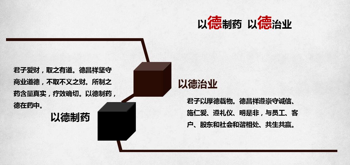 以德制药: 君子爱财,取之有道。德昌祥坚守商业道德,不取不义之财。所制之药含量真实,疗效确切。以德制药,德在药中。